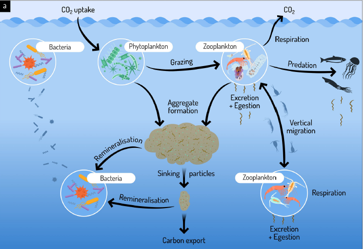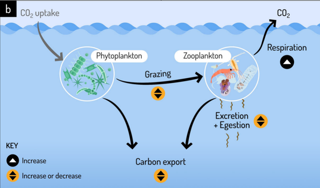 " R* q( g$ S) f% r* A (3)浮游动物粒径变化。随着海洋持续变暖,较小的桡足类物种可能会占主导地位,对渔业生产和碳封存会产生级联效应。 此外,气候变化影响浮游动物的行为和粒径结构后,进而会对渔业生产和碳封存产生复杂的连锁反应。文章提到,由于环境条件的变化,浮游动物元素化学计量会发生变化,同时,随着海洋变暖,浮游动物的呼吸将加速,但是消化和排泄的变化不明确,这些不确定性与浮游动物物候学、分布范围和粒径结构的不确定性相结合,使得在未来条件下无法准确预测浮游动物如何调节生物碳泵。另外,浮游动物群落的变化可能会影响高一级捕食者,因此需要进一步加强浮游动物数据的监测和管理。4 j9 V! u$ d0 u/ |" m