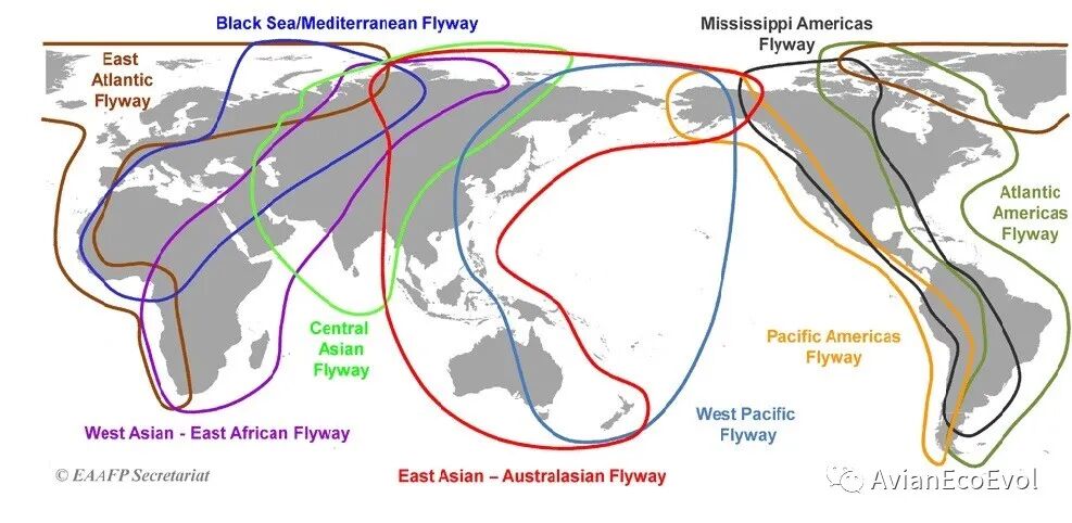 世界九大鸟类迁徙路线 Flyway(迁徙路线)是长距离迁徙鸟类跨越不同国家﹑甚至陆洲之间所采用的飞行航线,如同飞机的航道一样。根据EAAFP(East Asian-Australasian Flyway Partnership),世界上的所有鸟类的迁徙路线大致可以归类为九条,其中,欧亚大陆﹑非洲及澳大利亚共覆盖六条路线:东大西洋路线(East Atlantic Flyway)﹑黑海——地中海路线(Black sea-Mediterranean Flyway)﹑西亚——东非路线(West Asian-East African Flyway, WAEAF)﹑亚洲中部路线(Central Asian Flyway, CAF)﹑东亚——澳大利亚路线(East Asian-Australasian Flyway, EAAF)及西太平洋路线(West Pacific Flyway, WPF),而美洲则拥有四条路线:太平洋美洲路线(Pacific Americas Flyway)﹑密西西比美洲路线(Mississippi Americas Flyway,或称为美洲中部路线Central America Flyway)﹑大西洋美洲路线(Atlantic Americas Flyway)及部分与欧洲和非洲中部共享的东大西洋路线。这些路线之间并非完全独立,而是会有重叠的情况。 ( G4 X% q! @5 V. l9 p( M& F: q
