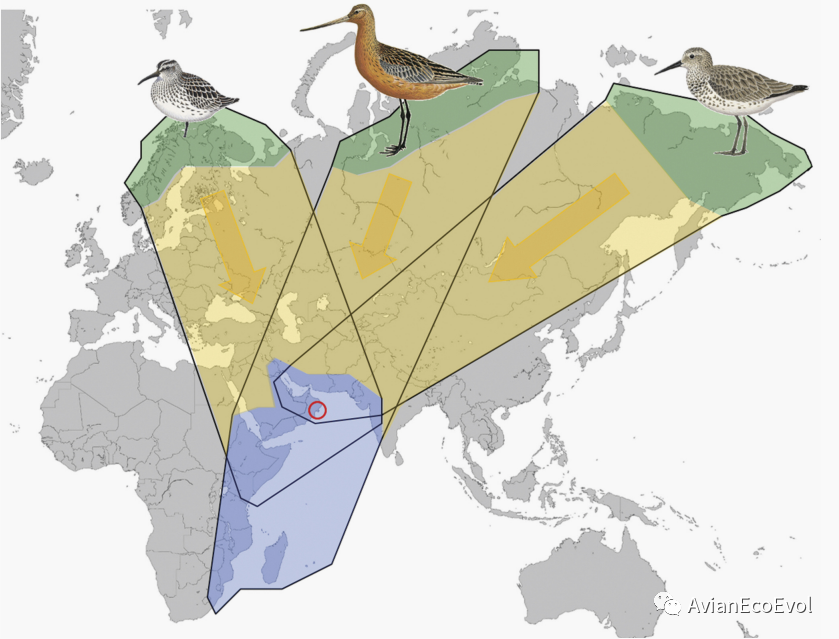 - F6 @7 b; }5 f" A. W 采用西亚——东非路线迁徙的阔嘴鹬(Limicola falcinellus. Broad-billed Sandpiper)﹑斑尾塍鹬和大滨鹬。图中的红圈代表它们一个重要的停歇地——阿曼(Oman)。