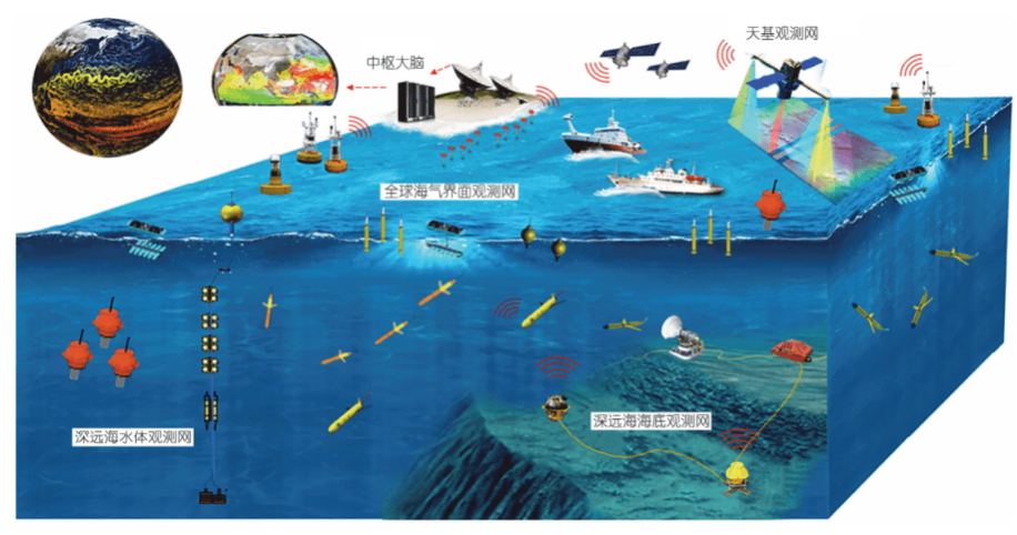 中国海洋大学吴立新院士提出的“透明海洋”,则是指要构建具备全球范围、全水深、多时空分辨率的海洋信息实时获取能力。“透明海洋”立体观测网分为4个层次的网络,包括:天基观测网、全球海气界面观测网、深远海水体观测网和深远海海底观测网,见下图。从而提升全球海洋尤其是“两洋一海”(西太平洋-南海-印度洋)和极区海洋环境信息获取能力,在此基础上形成我国核心战略海域的环境安全保障能力,可为国家实施“一带一路”倡议保驾护航,同时也造福海上丝路沿线国家的减灾防灾和海洋生态保护等。