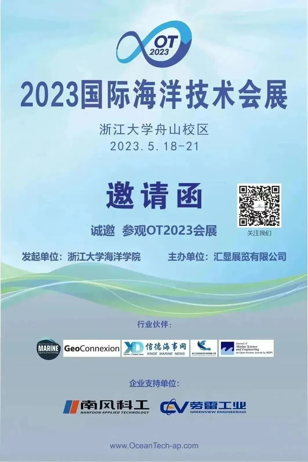 OT国际海洋技术会展开幕在即,浙江大学舟山校区的校园内的巨型帐篷已在转眼间再度架起,盼望已久的OT会展将于5月18-21日与第六届全国海洋技术大会同期举行。届时海洋技术领域的朋友们将在舟山与千多专家学者共聚一堂,进行精彩的学术技术交流,激起缤纷的浪花!参观OT会展请扫描以下二维码预先登记参观!