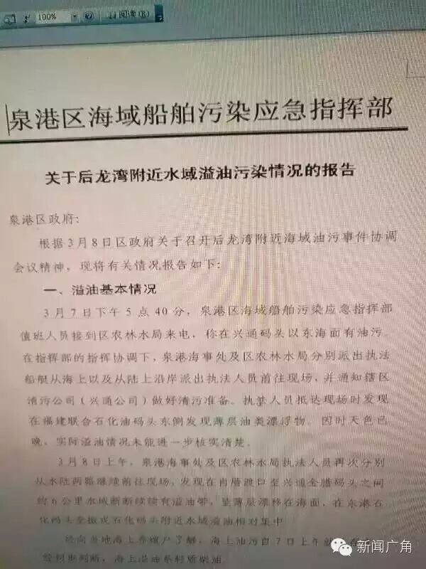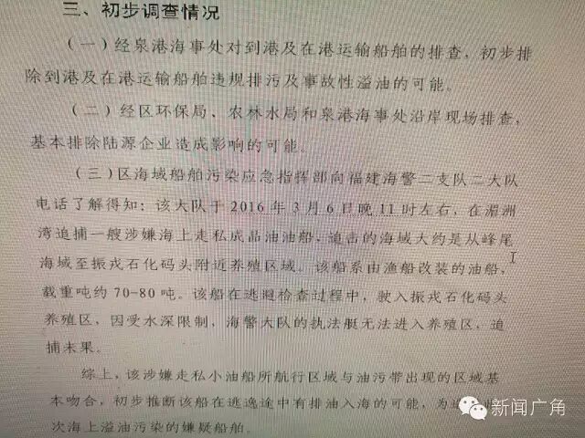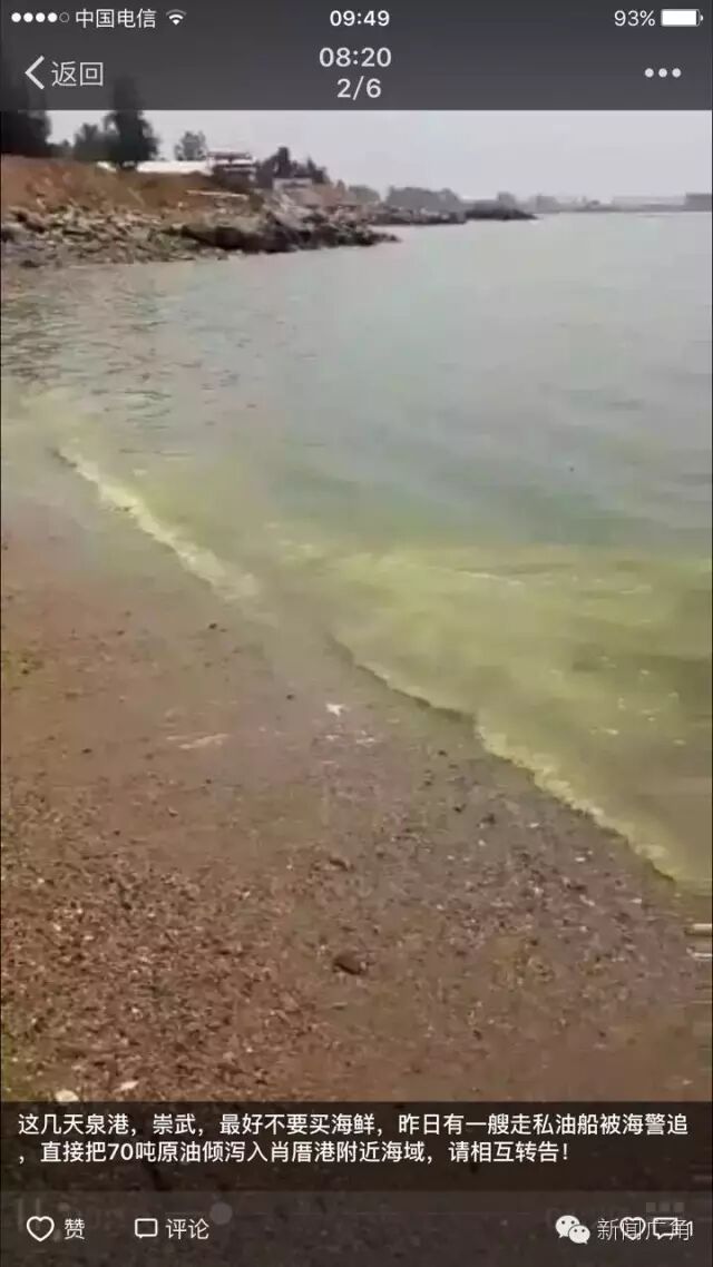 点击上面蓝色字 即可免费订阅 泉港广电微信号:qzqggd权威新闻,快捷服务信息,尽在泉港广电! 最近在泉州人,特别是泉港人的朋友圈里流传着这样一条消息和视频:“这几天泉港,崇武,最好不要买海鲜,昨日有一艘走私油船被海警追,直接把70吨原油倾泻入肖厝港附近海域,请相互转告!”