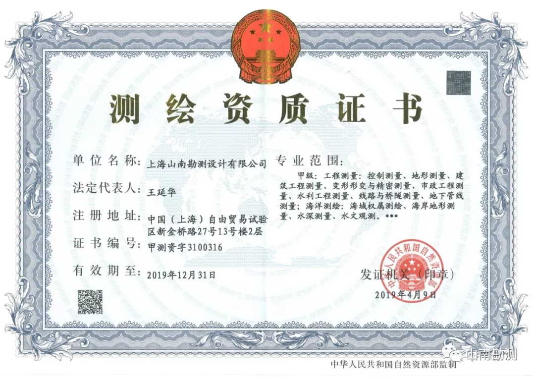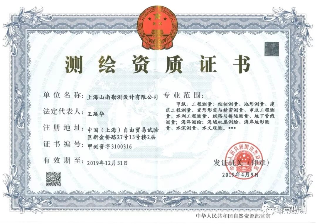 * y% ~* J+ @+ V7 L) q8 p- R4 z 4月9日,公司获得由中华人民共和国自然资源部审核批准的“测绘资质海洋测绘甲级”。