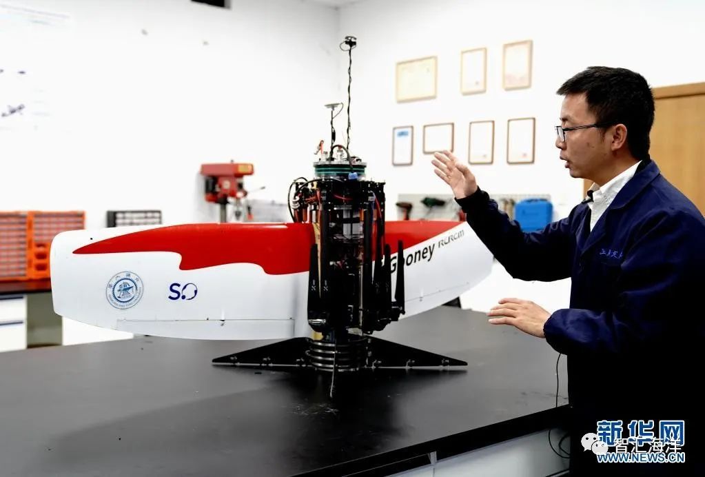 5 m A& e3 M; Z 上海交通大学海洋学院海洋技术团队曾铮副研究员介绍“哪吒”。新华社记者 张建松 摄
