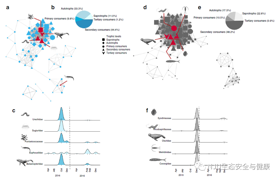 2015年和2016年秋季(蓝色)子网(a-c)和2015年12月(灰色)子网(d-f)的网络可视化。蓝色(a)和灰色(d)子网以节点(分类群)和边缘(相关性)显示,代表各个分类群之间的联系。为了最好地显示子网,仅显示网络连接(边权重)高于阈值0.2的分类群(即,去除了低相关性,参见边计算方法)。在子网内检测到的不同营养级用不同的符号表示,参见图例。这些分类群说明了蓝色和灰色子网络中共存分类群的复杂性,在此基础上选择分类群(c)和(f)的分类群表示。(b)和(e)表示每个子网内营养级的分布。分类单元节点符号的大小与单个分类单元在子网内的边连接数量有关,边的宽度代表两个给定节点之间相关性的权重。每个子网内的红线指向子网内高度相关的分类群(r > 0.9)或高度关联的分类群(前10%以内),在(c)和(f)中突出显示。在我们的采样期间,这些分类群的比例丰度在(c)和(f)中给出。图(c)和(f)x轴上的刻度线代表我们对这些分类群进行观察时的采样次数,y轴的高度是相对于每个分类群的观察次数而言的,并不代表绝对丰度值或生物量。垂直虚线表示2016年1月1日。