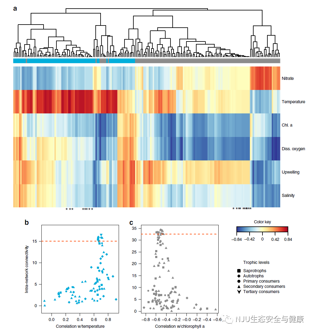 最近的研究表明,在微生物研究中,中心性的程度可以以85%的准确率识别关键分类群,尽管这也遭到了一些批评。这种预测能力尚未在从微生物到哺乳动物的跨营养级研究中得到检验。在最相关的分类群(前10%)和与温度或叶绿素a显著相关的分类群(图3b,c,红色虚线上方)中,我们发现了所有营养级和所有生命领域的代表。从秋季(蓝色)子网来看,不同营养群的顶级代表包括棘螠科(多毛纲)、芮氏水母科(原生动物)和浮霉状菌目(细菌)(补充表3)。这些分类群分别代表次级消费者、初级消费者和腐生物。