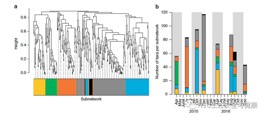 a. 基于所有分类群丰度指数变化的聚类分析,使用Kendall相关系数的树状图。这些颜色对应于不同的子网。b. 结合图1-a,在采样时间点上,每个子网中观察到的分类群丰富度显示了2015年12月的最高累积丰富度。阴影部分代表春天和秋天,白色代表夏天和冬天。