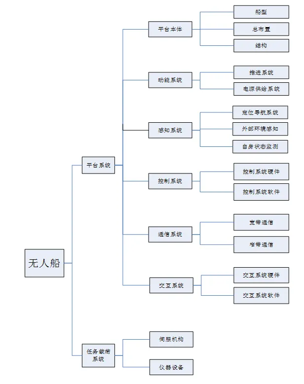 D7 ?# R4 j+ c5 x! t  01无人船的系统组成无人船由平台系统和任务载荷系统组成,两系统之间通过通用接口进行集成。平台系统包括平台本体分系统、动/能分系统、感知分系统、控制分系统、通信分系统和交互分系统,六个分系统共同组成无人船最基本的通用单元,可以独自操作运行,是为完成不同任务而设计的搭载平台。任务载荷系统指无人船用以执行任务的仪器设备及配套伺服机构、装置,可根据不同任务目的、用途规划出不同的任务载荷系统。