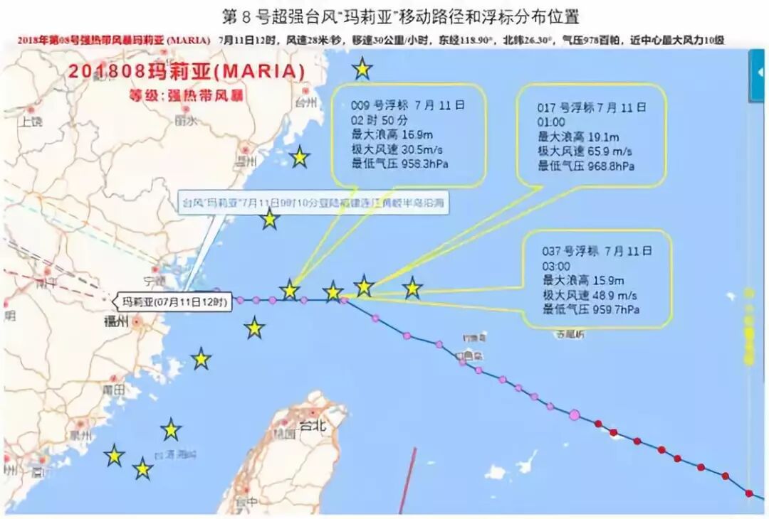 ; @' @3 c3 D" D& U* K 山东省科学院海洋仪器仪表研究所作为海洋气象监测浮标的研发生产单位,为海洋气象预报部门提供业务化监测浮标。在此次超强台风“玛莉亚”过境过程中,监测浮标捕捉到大量珍贵的台风数据。其中布放福建和浙江外海的7个浮标处于台风12级风圈移动范围内,全过程实时记录了“玛莉亚”移动过程中的气象、水文等参数,捕捉到了台风造成的超级强风和狂涛。其中017号浮标在7月11日01时测得最大浪高19.1m,有效浪高14.6m,02时30分记录到超过17级的飓风,风速65.9 m/s。之后不到两小时,在017号浮标西南25公里处的009号浮标,捕捉到最低气压958.3hPa----这一气压值低于“玛丽亚”登陆时的台风中心气压960hPa。