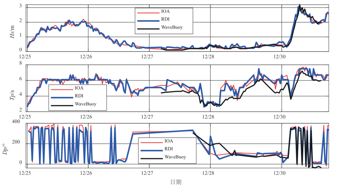 1 }; h$ ]5 w7 j! q. \) w 第一次试验的波浪反演结果序列对比图见图5。序列统计表明试验时间段内,布放点波浪特征观测结果:⑴有效波高HS,IOA观测值为0.13~2.83m,RDI观测值为0.12~3.05m,波浪浮标结果为有效波高HS与ADCP测波结果一致性很好;⑵谱峰周期TP,IOA观测值为2.9~7.72s,RDI观测值为2.6~7.5s;波浪浮标结果为有效波周期TS与ADCP结果趋势一致性较好,数值上比ADCP结果略微偏小;⑶谱峰方向DP,分布范围为0°~360°,趋势对比中,使用实验平台提供的波浪浮标波向结果中主波向Dmain作为参照。由于方向结果存在360°周期性,为了便于对两列DP序列进行趋势对比,当两列DP结果序列相差大于180°、小于180°时,对该点IOAWaveADCP的DP值分别减、加360°。 * [9 X5 R! w7 g' T