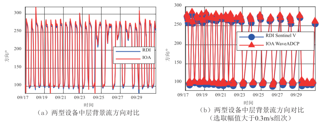 . H% C3 H. Y3 s* J6 ] a( e; p 第一次比测实验观测时段为2019年12月25日至31日,观测周期为每半个时的前20min进行一组观测,共获取了239组结果。实验期间的全组次流速剖面中选取中层背景流方向进行对比,如图4(a)所示。近岸浅水潮流空间变化受水深变化和地形影响,选取背景流幅值大于0.3m/s组次(共108组)的背景流方向结果序列,如图4(b)所示。对两仪器固有偏差的相对值进行统计平均,得到第一次比测实验中两设备罗经固有偏差的相对值为9.3°。 7 U* b1 V2 w# l: m