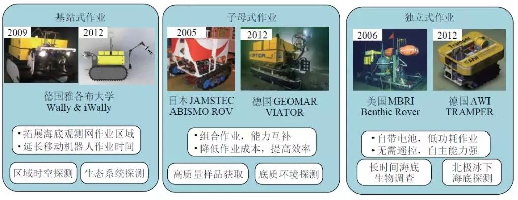 ; i8 _$ G- k% R 按照海上作业形式的不同,本文将小型的深海爬行机器人分为基站式作业型、子母式作业型、独立式作业型3种,如下图所示。 ) w" G1 y$ b0 J$ }, X+ ^$ E