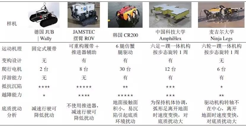 当前服役的深海爬行作业的小型机器人系统,均采用了履带式构型,通过设计可重构的履带构型、使用推进器辅助等方式可以提高海底爬行式机器人的海底行走适应性。下表对比列出了几种典型海底可爬行机器人的爬行构型特征。