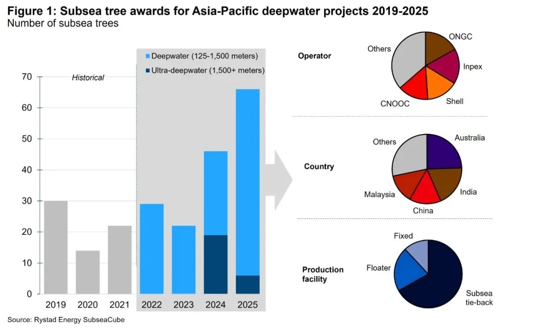' k5 ?' A+ x' K" o3 K6 S  随着油气公司启动亚洲和其他地区的深水开发项目,今年亚太地区的海底市场将会回暖,预计在水下脐带缆、立管和和出油管线(SURF)、设备和服务方面的支出将达到40亿美元左右,这将为海底设备供应商行业创造机会。我们将在本文看看未来几年亚洲(不包括中东地区)和澳大利亚海底市场领先的细分市场和项目。深水项目(水深超过125米)占据了亚太地区海底市场的最大份额。睿咨得能源(Rystad Energy)预计,2022-2025年,该地区深水项目将授出约160套水下采油树合同,其中四分之一将由澳大利亚授出。在2022-2025年授出的水下采油树中,大约15%可能会用于超深海项目(水深超过1500多米),这将导致对更复杂海底系统的需求激增。我们预计,到2030年,亚太地区的超深水项目将授出近50套水下采油树合同,与过去该地区超深水项目仅授出了15套水下采油树合同相比大幅增长。 (来源:睿咨得能源)- END -