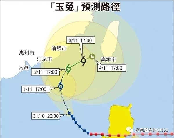 根据香港天文台热带气旋路径图预测,“玉兔”会呈U形转弯移向台湾,並再次升级为台风,不过它后劲不继,之后会再减弱为强烈热带风暴,並逐渐消散。 S* f7 Q& `( f s* s$ h/ G4 w