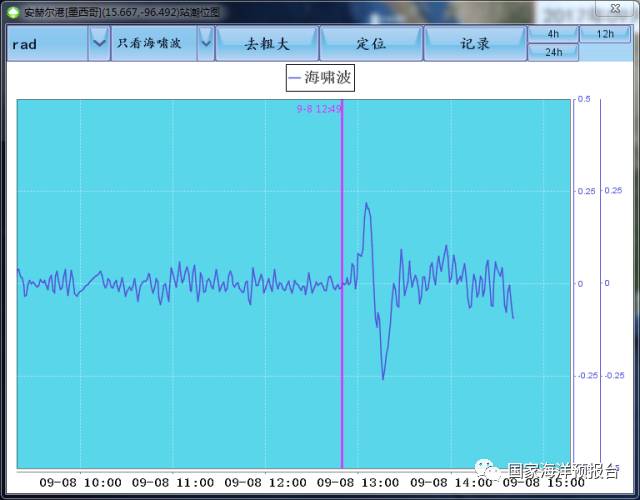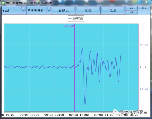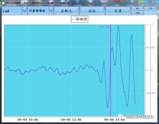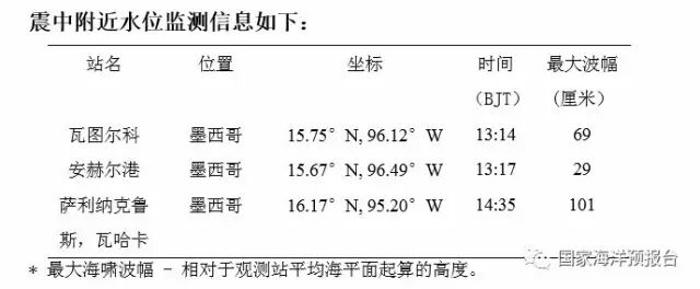 / N8 ]* v7 u1 k" }$ h0 z; s 首份海啸消息发布后,预报员仍继续监控最新的观测数据,滚动发布海啸监测预报信息。此次地震海啸过程,震中附近的萨利纳克鲁斯观测到1米的海啸波幅。主要影响墨西哥西岸的局部地区,对其他地区影响较小,并且不会对我国沿岸造成影响。   5 j" W7 R! [1 \& F- a