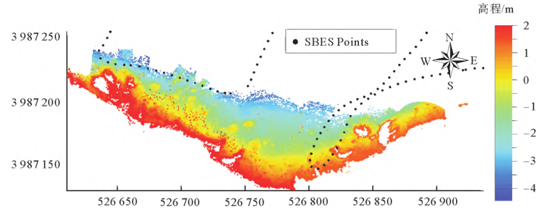 7 F3 x0 k6 i* ] 经计算,测区平均海面高程为3.394m,海底最深点高程为-2.746m,该数据中ALB最大探测深度(基于平均海面)即为6.14m。本次实验同步采集的赛奇盘平均深度为2.61m,因此本次ALB实验的最大测深约为2.4倍赛奇盘深度,基本满足系统规定指标。此外,风、浪、太阳辐射等环境因素也对ALB测深能力有重要影响。值得注意的是,此处获得的最大探测深度是基于平均海面的,最大穿透深度要大于6.14m。通过此次实验可知,在实际海岸带测绘作业中,可先进行赛奇盘深度的测量工作,选择有利于机载LiDAR测深的作业海域、作业季节,有针对性地开展海岸带机载LiDAR测深工作,以提升测绘效率、降低作业成本。 + ?$ T7 I1 a' S
