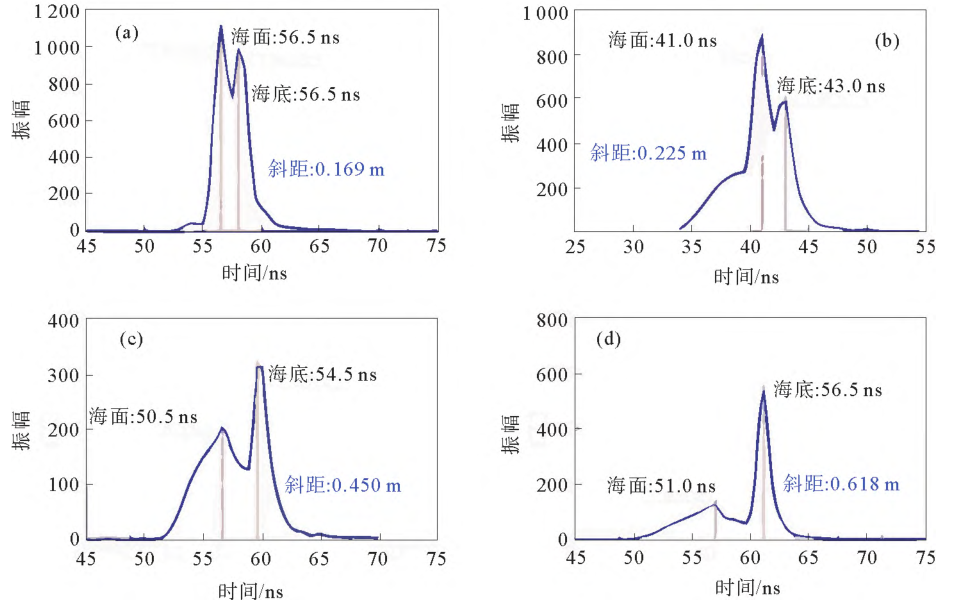 选择4组水下斜距小于1m的典型波形进行分析,如图7(a)所示,海面与海底的时间差仅为1.5ns,对应的水下斜距最小值约为0.169m。顾及绿光进入水体后的入射角θ,由斜距L计算垂向水深h(h=Lcosθ),其最小测深值约为0.16m。通过分析知,在现有硬件条件下,研究确定一种极浅水波形分解算法,如何将海表面和海底反射信号从叠加的测深回波信号中准确分离出来,是进一步提高ALB系统最浅探测能力的关键所在。 ) {4 H5 ~) e1 I# H0 d