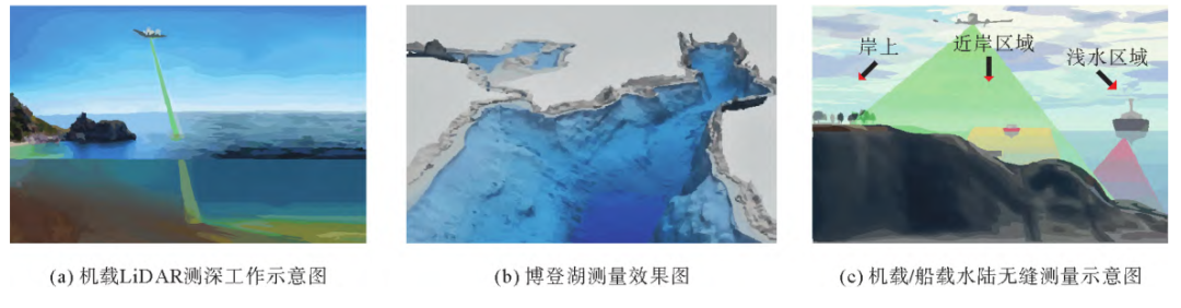 1 x7 j# g* S1 N+ v% R 机载LiDAR测深(ALB)同时具备水陆地形测量功能,具有测量效率高、覆盖面广、水陆两用等诸多优势。其测深能力受水质限制,理论最大测深一般不超过70m,可以解决复杂浅水水域测量的技术难题,特别适用于浅水海岸带附近区域等复杂地形的快速探测,实现海岸线水上水下地形的无缝拼接。由于机载LiDAR测深和船载声学测深(图2)在测量区域和测量范围方面具有一定的互补性,将二者数据融合可以获得水上水下全覆盖三维地形数据(图2(c))。早期多采用有人机搭载测深LiDAR设备获取水陆一体化空间数据,随着技术发展,目前出现了体积更小、质量更轻的便携式测深LiDAR和无人机平台,无人机载LiDAR测深系统应运而生。相较于有人机载LiDAR测深系统,无人机载LiDAR测深(UAV-ALB)作业空域申请更为方便,成本控制也更有效。现阶段,无人机载LiDAR测深系统在国内尚未得到广泛应用。