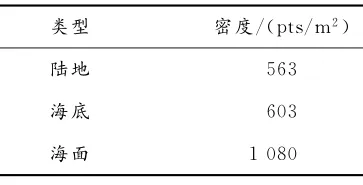 测点密度可直接反映地形地物的空间分布特点,对海岸带实景三维模型构建等工作至关重要。为了解点云密度情况,对陆地点、海面点、海底点的密度特征进行了统计。如表2和图6所示,RIEGLVQ-840-G在陆地和水下均具有极高的测点密度,可以满足后续海岸带点云数据应用的需求。 " V9 `% W+ {. S: K8 b) \