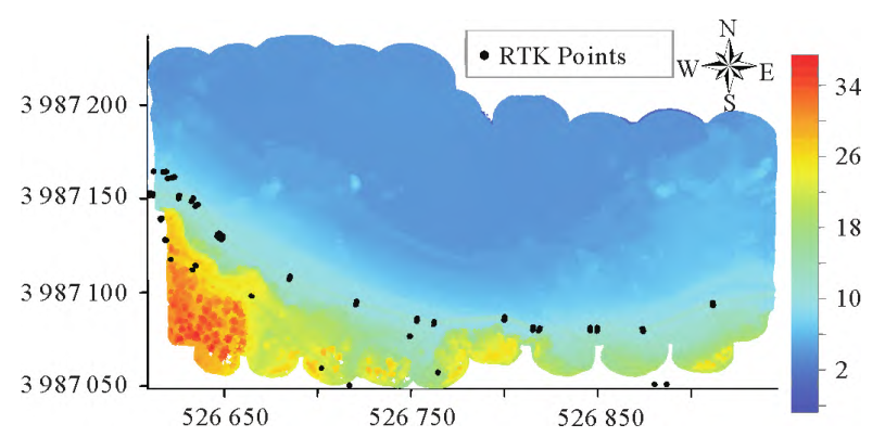 & Q1 P4 E# d% I2 O4 P `& ] ⑴RIEGLVQ-840-G无人机载LiDAR测深青岛实验的水深点密度达603个/m2,最浅探测深度仅有0.16m,最大探测深度(基于平均海面)达6.14m,水下测深精度达17.6cm(与船载单波束测深数据对比),陆上高程精度为5.2cm(与陆上RTK数据对比)。