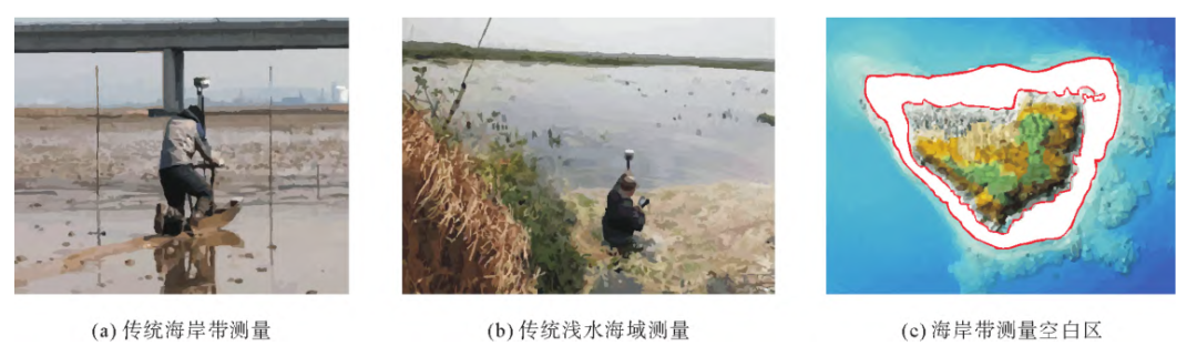 点击上方“溪流之海洋人生”即可订阅哦海底地形数据可为生态环境保护、灾害防治、旅游开发以及交通规划提供基础地理数据支撑,也是相关海洋科学研究、海洋工程应用、海洋军事决策的重要数据来源。然而,由于海岸带、海岛礁周边浅水海域地形变化大、环境复杂,采用常规的海洋测绘方式效率低、成本高、难度大、风险高,会存在一定的测量空白区域(图1)。如何突破复杂浅水海域快速高精度测量,成为当前亟待解决的海洋测绘技术问题。 % f% p5 L( M* E5 H9 [