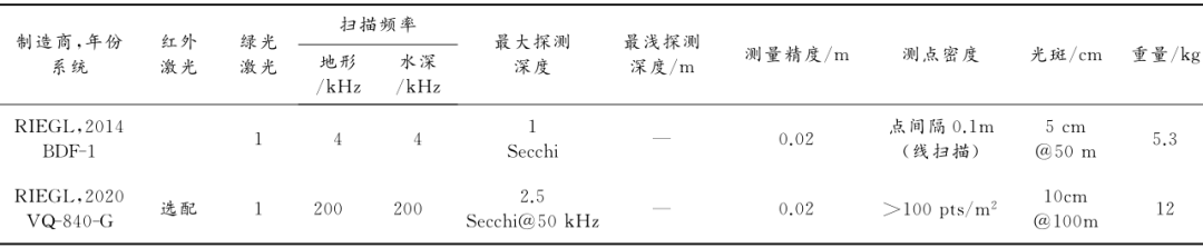 8 }5 O# ^' R, H! U; x2 x' a; g 最早开展无人机LiDAR测深系统研发的是奥地利RIEGL公司,相继推出了RIEGLBDF-1和RIEGLVQ-840-G系统,在国外浅水及岸线地形测量工作中得到应用,包括国外海军浅水测图等任务(表1)。近几年我国中科院上海光机所也开始着手研制国产无人机LiDAR测深系统Mapper4000U,并于2021年研发成功,已在福建漳州、山东青岛、海南万宁等地进行海试,获得了一批有价值的数据。
