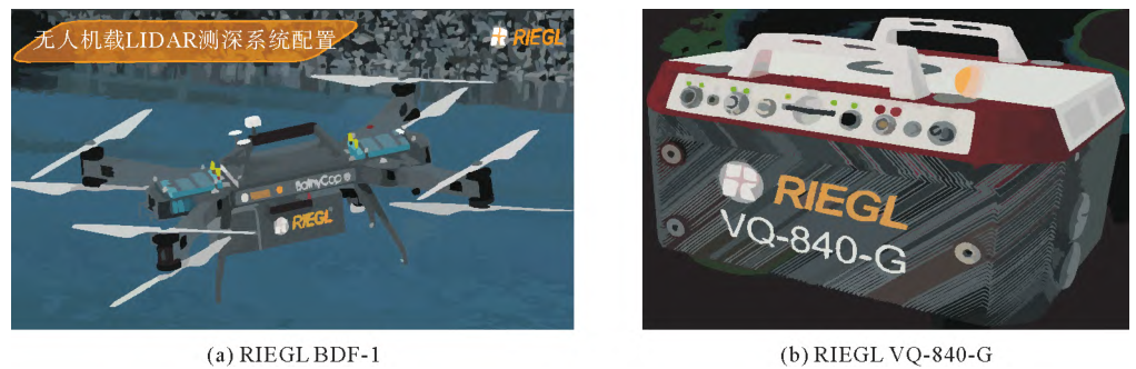 ⑵RIEGLVQ-840-G是一款完全集成的紧凑型机载激光扫描仪(图4(b)),能够同时进行水文和地形测量。该系统集成了经过原厂检校过的GNSS/INS系统,其紧凑而轻巧的设计可适用于多种飞行平台,包括无人机平台。通过强大的脉冲激光源,发射狭窄的绿色可见激光束,激光束以椭圆扫描模式偏转,以极小变化的入射角打入水面,实现高分辨率的水下地形测量。