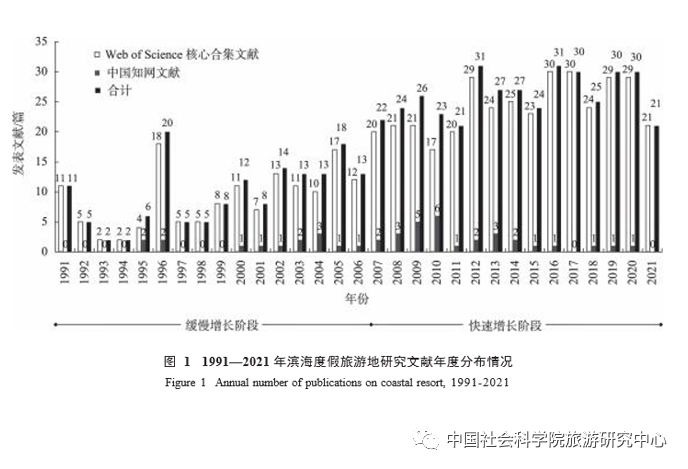 5 w: k0 ~# X% _" c 2.1 数据来源 分别Web of Science核心合集和中国知网两个数据库中对国内外滨海度假旅游地研究的重要文献进行筛选。首先,以Web of Science核心合集收录文献为数据库,以TS=((coastal resort OR beach resort OR seaside resort OR marine resort) AND( tourism OR tourist OR visit* OR resident OR local people OR industry OR econom*))为检索式,检索时间为1991年1月1日-2021年12月31日,以“英语”为语种,文献类型选择研究论文,剔除与研究主题不相关的文献后,最终甄选得到研究文献553篇,构成国外相关研究的数据样本。其次,在中国知网数据库以主题词SU=(滨海+海滨+海洋+海岛+海岸)*(度假区+度假地),期刊来源选择北大核心、CSSCI和CSCD三种类别,检索时间同上,剔除与研究主题不相关的文献得到研究文献43篇,构成国内滨海度假旅游地研究文献数据。由于国内研究成果数量较少,因此将筛选的国内外文献进行整合分析,全面梳理滨海度假旅游地研究进展。2.2 历程回顾滨海旅游业开始于19世纪,滨海度假旅游地研究是旅游领域中古老而经典的话题,其最早的形态研究可追溯到20世纪30年代。其中,地点、空间、环境是滨海度假旅游地研究的三大核心对象。1991-2021年间,滨海度假旅游地研究呈现持续增长态势(图1)。20世纪90年代,西方在经历滨海度假旅游地大规模衰退后,相关研究一度放缓,此后学者对于度假地衰退原因和转型发展进行了更多思考和讨论,研究趋势得到扭转,研究数量逐渐上升;同一时期,国内开启了滨海度假旅游地研究进程,但由于彼时发展度假旅游主要针对国际旅游市场,国内度假市场需求不足,度假区发展参差,相关研究进展缓慢。此后,随着全球气候变化和生态环境恶化,以海洋自然资源为基础的滨海度假旅游地可持续发展研究受到广泛关注,2007年以后平均每年发文量均在20篇以上,呈现快速增长态势,研究主题更加多元,同时对亚洲等新兴滨海度假旅游地关注明显增多,尤其是在中国双循环发展新格局和建设世界级度假区背景下,滨海度假旅游地研究迎来新的发展契机。