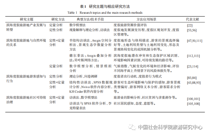 % \3 _/ T: q' {7 C% B9 Q (1)滨海度假旅游地是“人-地-业”交互作用的复杂旅游地域系统,相关研究涉及自然生态、经济社会、旅游文化、利益相关者等各个方面。由于国外滨海度假旅游地出现大规模衰退,相关研究曾一度放缓。随着度假地复兴与转型发展,其衰退成因研究逐渐增多。相较之下,由于国内度假旅游市场发育不成熟、国际度假旅游目的地竞争激烈等原因,实践发展缓慢,故相关研究起步晚、成果较少,且存在重实践、轻理论等问题。近年来,在全球气候变化、旅游市场结构调整等复杂形势下,滨海度假旅游地研究数量持续上升,方兴未艾。 (2)1991-2021年间,滨海度假旅游地研究形成了多元化主题,重要文献主要发表在旅游学顶级期刊《Tourism Management》《Annals of Tourism Research》《Journal of Sustainable Tourism》《旅游学刊》以及《Ocean & Coastal Management》《资源科学》《经济地理》等海洋学、资源学、地理学主流期刊上,可见滨海度假旅游地研究受到了旅游学、海洋学、资源学、地理学等多学科关注。相关研究聚焦于滨海度假旅游地产业发展与转型、滨海度假旅游地与自然环境的关系、滨海度假旅游地游客感知与行为、滨海度假旅游地社区可持续治理等4个方面。其中,滨海度假旅游地研究多以实证分析为主,在联合国可持续发展目标(SDGs)和全球复杂形式下亟待构建滨海度假旅游地可持续发展研究理论框架,促进研究内容深化和研究范式形成;对滨海度假旅游地物理空间、海洋自然系统着墨甚多,对度假地非物质空间与文化问题关注不足,且主要关注单一要素分析,旅游地复杂系统耦合发展的机制机理探讨有待加强;新形势、新实践、新理念背景下的滨海度假旅游地研究薄弱。(3)研究方法从早期以定性研究为主逐渐转为定性与定量研究相结合,但具体技术手段上以管理学、社会学、地理学、景观生态学传统方法为主,尤其是大数据时代的一些新数据、新方法、新技术手段应用不足,亟待创新。具体来看,相关研究基于ArcGIS空间分析法、景观生态学数量分析方法、计算机情景模拟法等定量研究方法和问卷法、访谈法等定性研究方法的混合应用,能够科学客观地揭示滨海度假旅游地发展规律和成因机制(表1)。然而,在全球复杂形势背景下,度假产业布局更新加快,度假旅游地正在经历更为复杂的系统演化与重构,传统的研究方法显然难以满足新时期度假旅游地研究需求,无法全面解析度假旅游地发展演化的新现象、新特征、新规律。