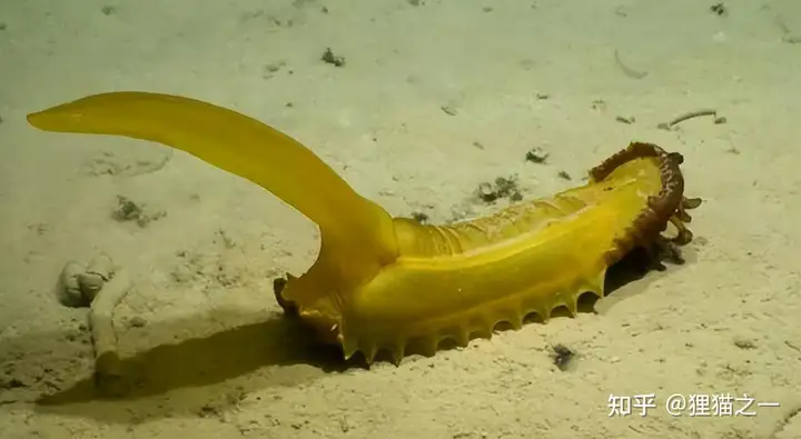 - T& Q- U* G9 G/ `# B+ u! {' _ 伦敦自然历史博物馆的科学家在探索位于夏威夷和墨西哥之间的太平洋克拉里昂-克利珀顿区发现了一种既视感很强的生物,它看起来像是独角毛毛虫,又像是被剥了一半皮的香蕉。