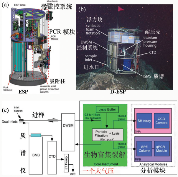3 q6 B2 a2 j$ ~) ]" k& l9 b4 J; F (a)环境样品处理器;(b)、(c)深海升级版D⁃ESP