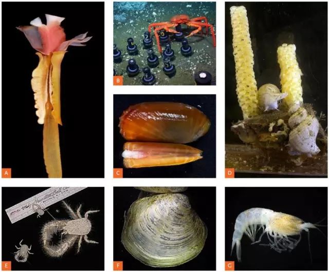 常见的实例有海生管虫(图4A)、蟹(图4B、E)和各种蛤(图4C、F)。与非冷泉系统的深海动物群落相比,冷泉系统的动物群落相对较大。许多冷泉生物的消化系统都已部分退化或完全消失。 , K/ |9 C$ O- t' Y