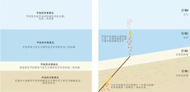 在海洋环境中,生物要利用从海底渗漏的甲烷中的“能量”有两种方式:缺氧氧化作用(AOM)和有氧氧化作用。 7 ^3 {/ e! _; a3 t# y Y