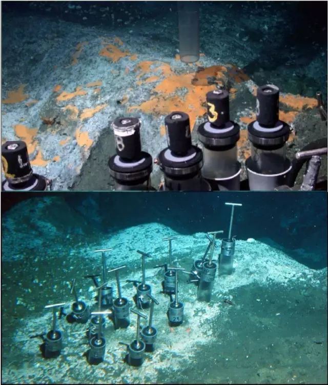 : f9 \4 S7 O3 m' |7 `$ W0 F$ j 注:太平洋东北部的Hydrate洋脊,白色和橙色的硫-氧化细菌簇覆盖在含有近表层水合物的沉积物上(Lisa Levin提供)。