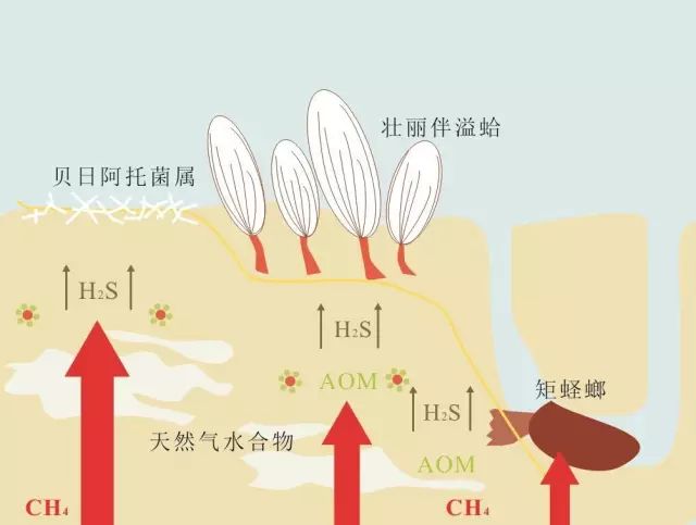 左侧:独立生存的硫氧化细菌簇(如贝日阿托菌属)生存于含有高通量流体的沉积物中。中间:巨蛤(如壮丽伴溢蛤)生存于含有中高通量流体的沉积物中。右侧:蛏螂(如矩蛏螂)生存于含有低通量流体的沉积物中。 9 `1 r, ]4 p% h5 r7 O, e9 G7 J' b