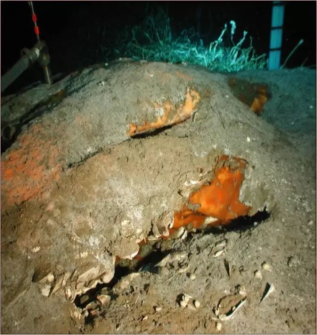 注:在活跃的甲烷冷泉之上、近海床位置能形成天然气水合物丘。上图为墨西哥湾水合物丘,水合物丘被少量石油染成橙色,部分覆盖有薄层沉积物(灰色物质)(Ian MacDonald提供)。 ( x! w% j( v: }6 S# e& n