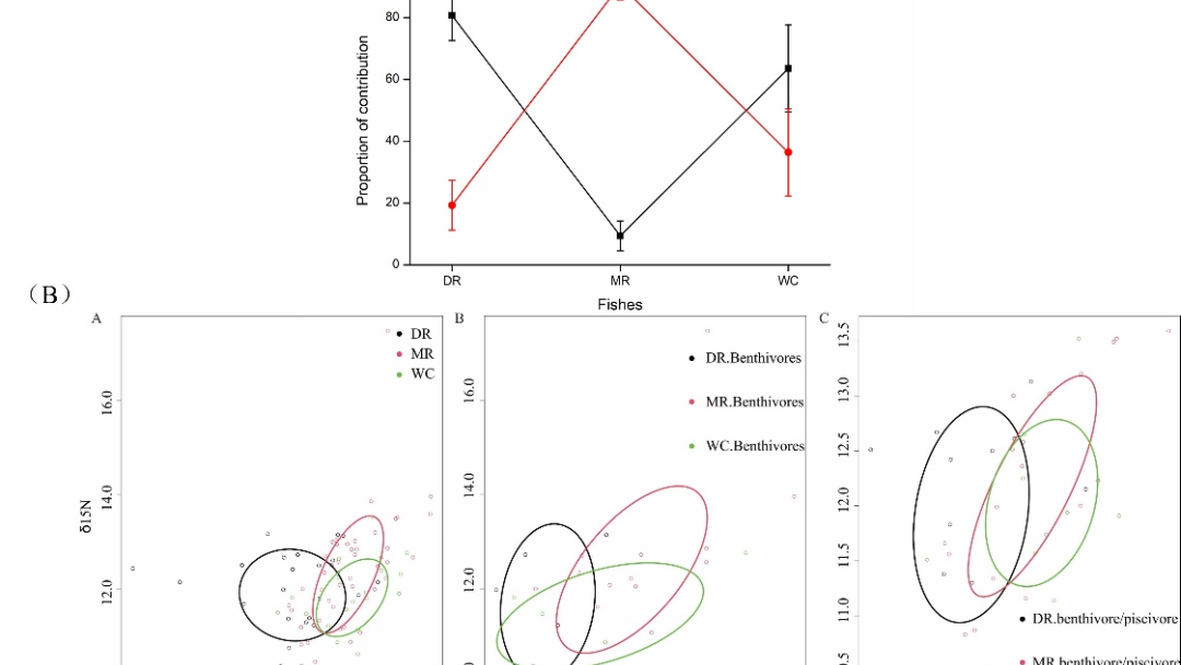 研究团队采用碳氮稳定同位素方法研究了珠江口万山、庙湾两个国家级海洋牧场示范区鱼类和大型无脊椎动物的食物网结构,结果表明万山海洋牧场以底栖生物/游泳生物食性鱼类为主,浮游生产是万山海洋牧场生态系统食物网的主要驱动能量(鱼类:80%,大型无脊椎动物:52%),海洋牧场生态系统具有较高的营养多样性和较低的营养冗余;而庙湾海洋牧场以底栖生物食性鱼类为主,底栖生产是庙湾海洋牧场生态系统食物网的主要驱动能量(鱼类:91%,大型无脊椎动物:78%)。大型无脊椎动物功能群以碎屑食性和肉食性类群丰度最高,是底栖食物网中的顶级捕食者。研究结果有助于深入了解珠江口海洋牧场生态系统食物网结构状况,可为珠江口海洋牧场人工鱼礁建设和渔业管理政策提供科学依据。