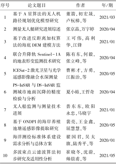 ( e2 s/ F' h5 E8 S. S7 f 2022年,《海洋测绘》期刊共出版6期,刊发论文共计104篇,主要聚焦海洋测绘专业以及与测绘学科相关的其他研究领域,其中包括基金项目支持的论文74篇,基金项目支持的论文占比约71%;第一作者学历为博士或职称为高级职称的论文56篇,约占54%,期刊复合影响因子为0.691。表1为2022年度《海洋测绘》优秀论文的评选结果,以前两年发表的论文被引频次为第一评选条件,论文下载次数为第二评选条件,综合排序前10篇评选为优秀论文,统计日期为2023年12月15日。从中可以看到,论文被引频次、下载量最高的研究领域主要集中在海洋大地测量、海道测量、海洋遥感等专业。