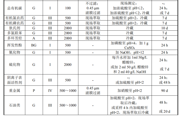 ②一般选择由硬质玻璃和聚乙烯塑料材料等稳定性强材料制成的样品容器。大多数含无机成分的样品,多采用聚乙烯、聚四氟乙烯和多碳酸酯聚合物材质制成的容器。常用的高密度聚乙烯,适合于水中硅酸盐、钠盐、总碱度、氯化物、电导率、pH 等样品贮存。对光敏物质多使用吸光玻璃质材料,如棕色瓶,必要时采用锡箔等遮光。常用玻璃质容器适合于有机化合物和生物样品的贮存。塑料容器适合于放射性核素和大部分痕量元素及常规监测项目的水样贮存。
