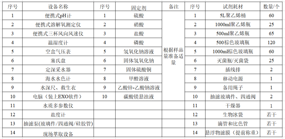 海水采样设备耗材准备单
