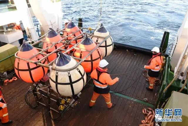 科考队员准备将高压气枪投入海水之中测量海底地层结构 ( o- N% E- ?) s8 @8 u1 _; [. X( g$ W2 i v