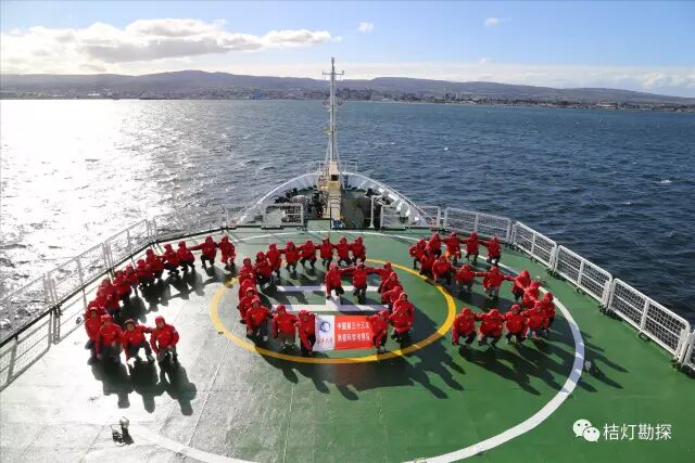 . m, h L$ i' B" ^% p- V6 M3 {4 L1 D 海洋六号”抵达智利篷塔,全船科考队员在直升机平台摆出 “CGS” (中国地质调查局英文简称)造型,以展现中国地质人进军南极的信心和勇气。+ O! G! f+ `3 u/ @