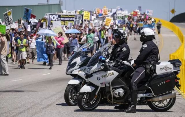 * r* l. I; I3 H$ e9 X 4月29日,全美举行370多场“人民气候游行”,美国民众纷纷走上街头反对特朗普气候政策“开倒车”。图为洛杉矶警察在“人民气候游行”队伍旁警戒。