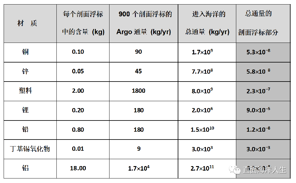 ( ^/ U" P7 [0 o5 b8 G& E 这里试图通过比较浮标与自然和其他来源的通量,来评估海底Argo浮标分解物对全球海洋的净输入量(表1)。表中第四列给出的塑料和TBTO的通量值代表人为的通量,原因是目前还很难获得这些量的自然通量。第四列的其他量仅用于自然通量,因为它们通常比相应的人为通量大几个数量级。这里已经将Argo通量(第三列)按900个浮标的数量进行了缩放,这是每年可能死亡并需要更换的浮标数量的上限。