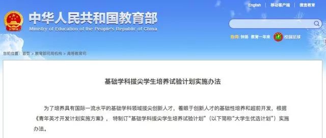 " ^/ i' B5 X2 d+ [4 R7 m" m7 ^ 2009年,“拔尖计划”在教育部、中组部、财政部的推动下,先行在数学、物理、化学、生物科学、计算机学科领域,选择了北京大学、清华大学等19所高校实施。该计划每年动态选拔特别优秀的学生,配备一流师资、提供一流学习条件、营造一流学术氛围,通过国内国外交叉培养,使本科生和研究生培养达到国际一流水准。 : U7 H& r% x9 ?# b( u8 H2 G