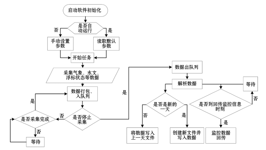 # \+ h; c! y4 @5 R+ L 软件的系统控制和数据采集流程如图8所示。浮标既要高速地采集大量数据,又要对每次采集的数据进行操作,若将采集数据和操作数据放在同一循环周期内,会降低数据采集效率,甚至导致端口缓存区内的观测数据可能未被及时读取而被下一周期的观测数据取代,进而造成数据缺失。为了避免以上情况发生,开发软件时,采用了队列操作模式,数据采集属于入队列循环,操作数据属于出队列循环,二者独立运行互不影响。 - w3 s/ u' W* e; A% D4 O, ?
