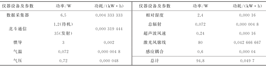 本文所选设备以及功耗情况统计如表2所示。若要保证采集系统能在阴雨恶劣天气无法充电的情况下连续15d正常工作,根据设备总体功耗,采用8块24V/125W的太阳能电池板进行充电,采用4节250Ah铅酸电池储能,其充放电性能稳定,价格较低,整体尺寸与重量相对较小,满足系统的功耗要求。 ' a0 o+ Y4 L8 m! U$ D