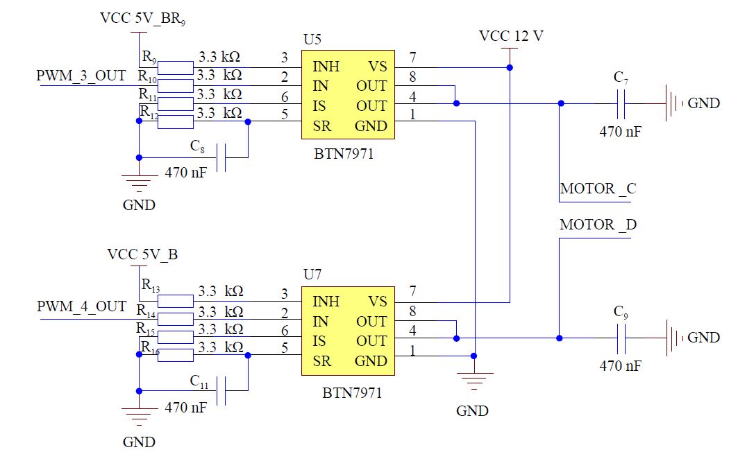 + p# H& O' T3 L% n6 D3 e 电机驱动采用两块BTN7971芯片构成的全桥电路,如图12所示。