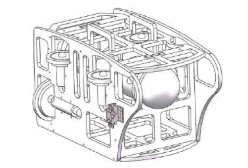 $ O- H$ n& }( y9 \% k. Z+ v 水下机器人骨架主要是用来固定密封舱体、推进器等部件。为了给水下机器人提供浮力,骨架上预留开口,在调节浮力过程中安装浮力块与配重块。为了使水下机器人本体设计更加轻巧,水下机器人本体选用耐腐蚀性的聚丙烯材料,多余的部分采用镂空设计,使得本体重量更轻。设计过程中,专门预留了传感器安装孔,并为电缆走线预设了空间。机器人框架如图9所示。 % @; c; g9 e" d S# ^